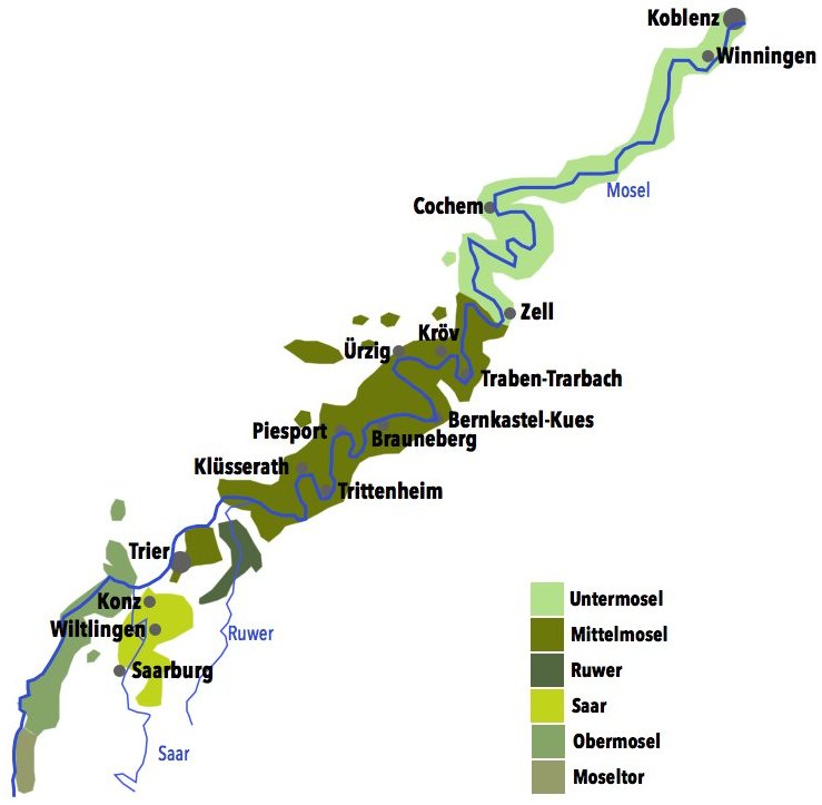 OrteKoblenz, Cochem, Zell, Briedel, Traben-Trarbach, Kröv, Ürzig, Bernkastel-Kues, Brauneberg, Piesport, Trittenheim, Klüsserath,Trier, Konz, Wiltlingen, Saarburg